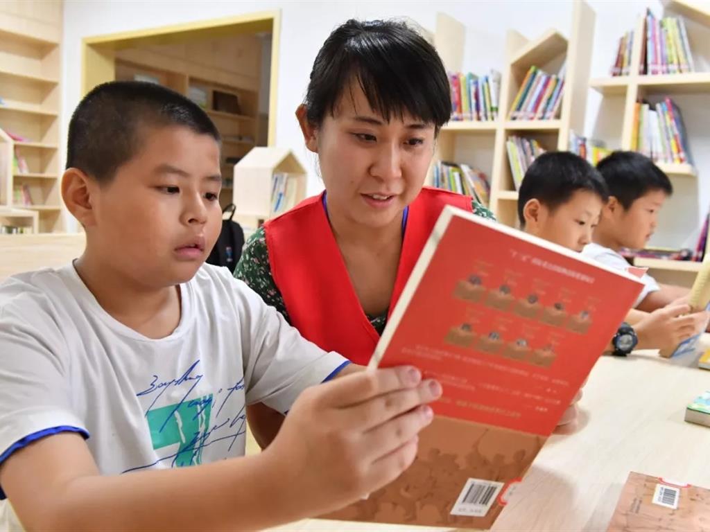 8月16日,在合肥市明光路街道填海巷社区少儿图书馆,青年志愿者正在指导孩子们阅读。