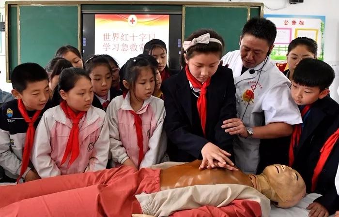 2018年5月8日,在合肥市香格里拉小学,医务人员正在向学生教授心肺复苏急救及手部外伤简易包扎方法。