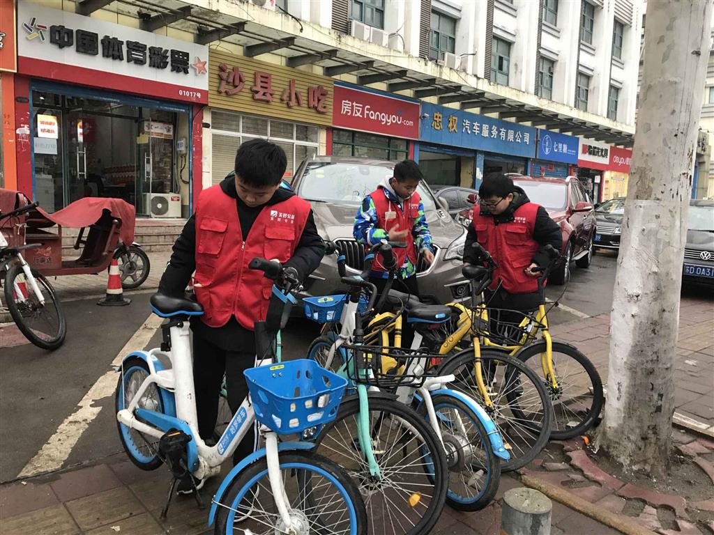 为提倡文明用车,呼唤共享自律,2月16日上午,明光路街道全椒路社区组织三十八中的学生开展规范单车志愿服务活动,共同整理规范主干道边上乱停放的共享单车。