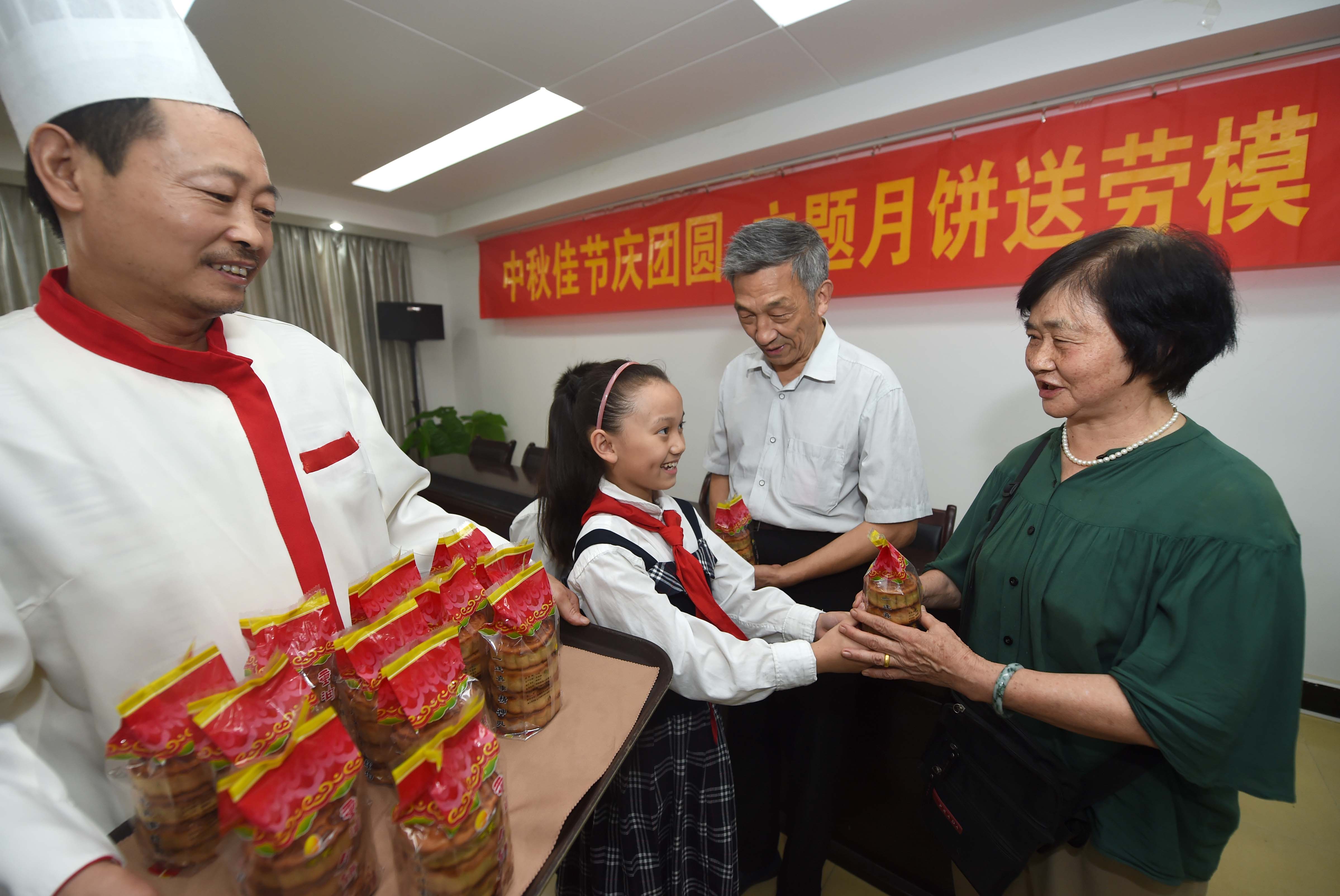 9月25日,在填海巷社区,传统重油月饼手艺传人张贵宝正带着社区孩子们制作“劳模”和“社区好人”主题月饼,并将制作好的主题月饼送给劳模和社区好人。