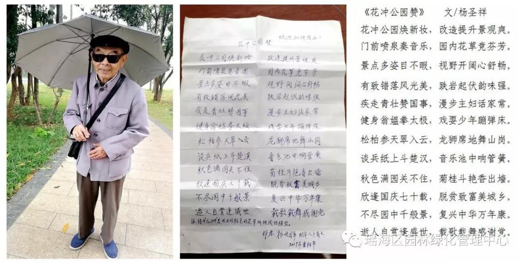 10月12日,年过七旬的热心市民杨圣祥老人,冒雨前来花冲公园办公室,送上一首赞美花冲公园的诗。表示作为长期居住在花冲公园附近的居民,见证着公园变迁和变化,这次花冲公园改造和开园,让人眼前一亮,不由让他诗兴大发,信手写下《花冲公园赞》,表达喜悦之情。