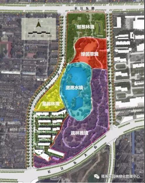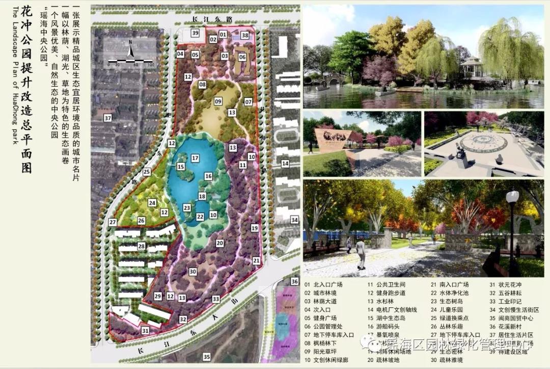 公 园 改 造 详 情 :花冲公园改造规划范围为北至长江东路,西至肥东路,南至长江东大街,东至新规划道路花冲路。 改造前公园总面积约93937平方米,本次改造面积扩增至116869平方米。
