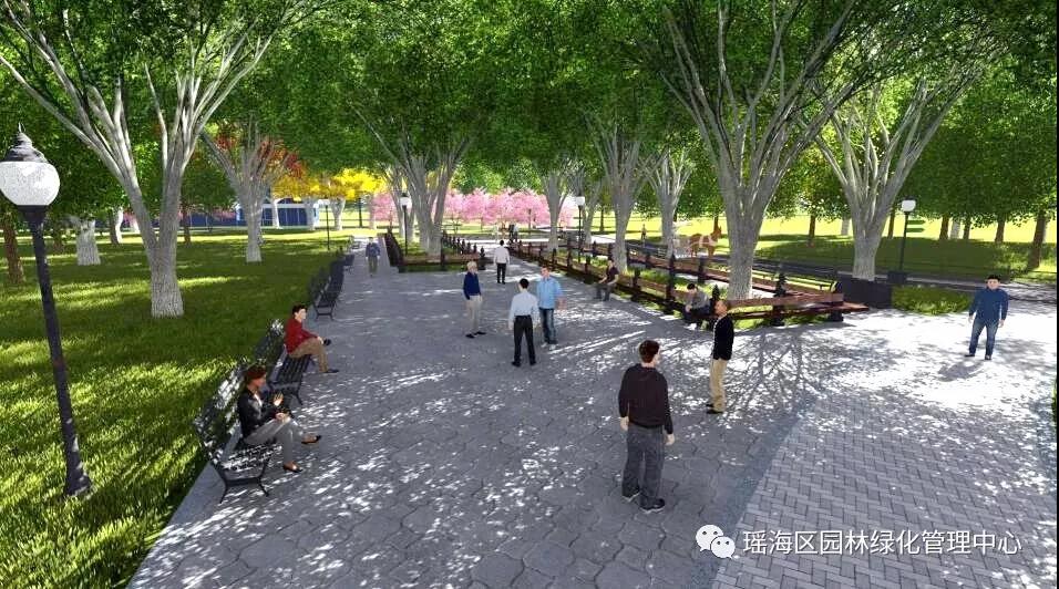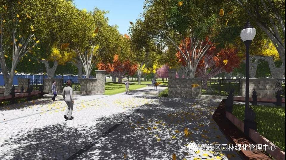由容易引发人群集聚的公园形象入口转变为进入城市自然境的环境入口,由露天集聚向林荫集散过渡。设计以植被季相为引导,将自然变化渗透到城市空间中。结合公园植被移栽建设充满活力的森林环境入口,强化整体的自然环境印象。入口区的银杏树阵、 旱喷广场、以及舒缓变化的坡地地形,在风貌上再现纽约中央公园的景观意向,强化市民入园的环境感知与联想。