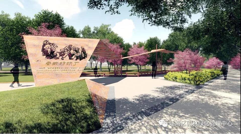 结合自然缓坡地形及现状植被,选取树形较好的大树,营造片疏林养情的林荫坡地空间。细化南北主出入口方案设计,并在南侧界面结合花冲公园历史设置了“状元花冲、先农坛、工业印记”等文化主题节点。
