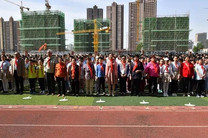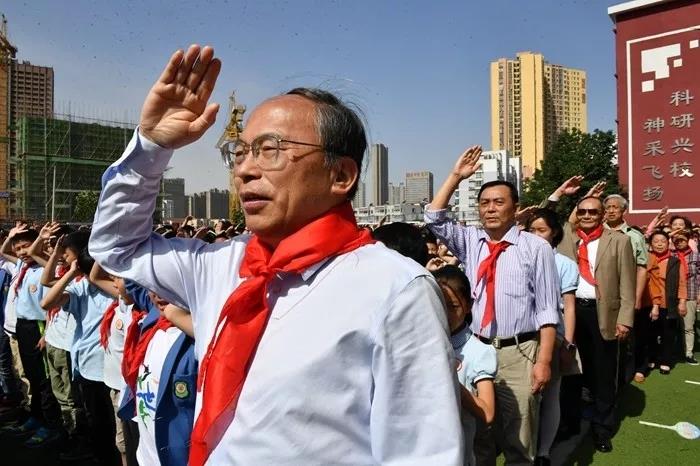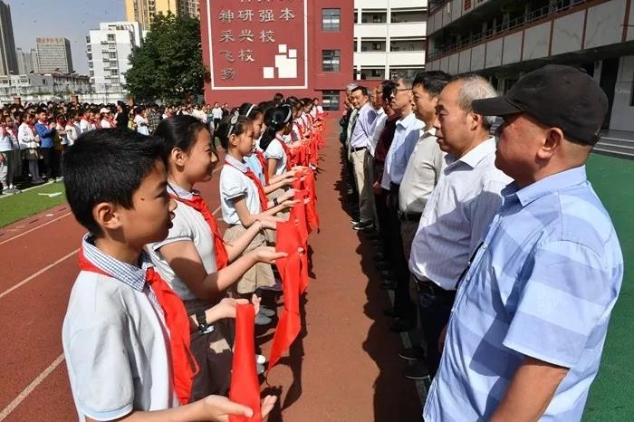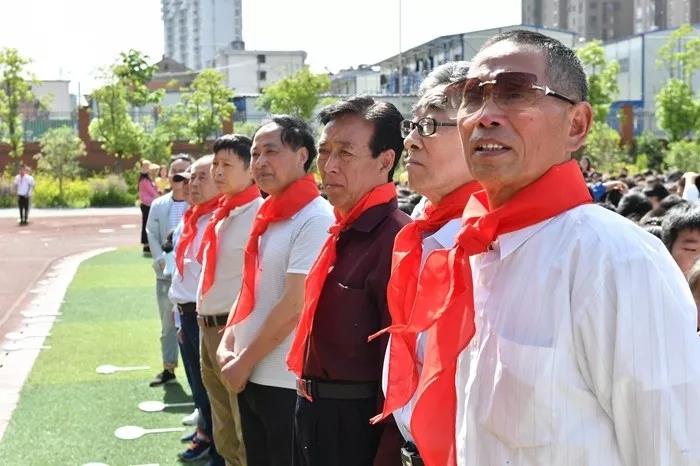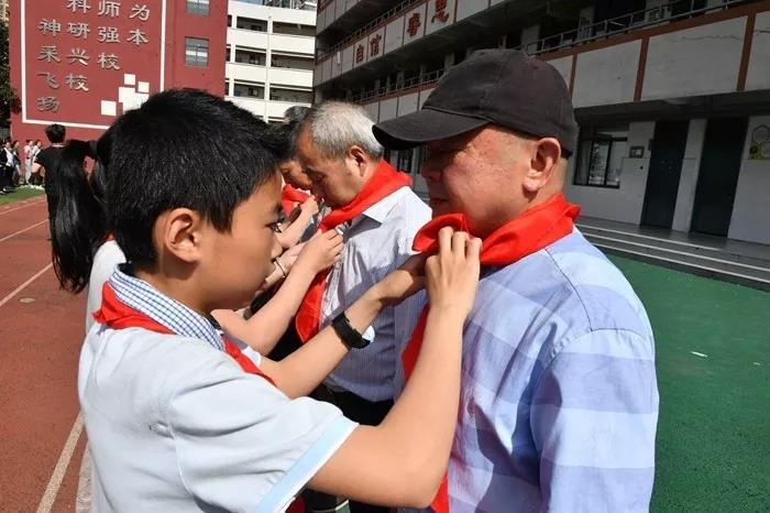 升旗仪式上,少先队员给爷爷奶奶辈的学长、学姐们佩戴红领巾,在庄严的国歌声中,老校友们再一次面向国旗敬队礼,时光仿佛回到了五十多年前,回到了他们的儿童时代,那时候他们也是光荣的少先队员。