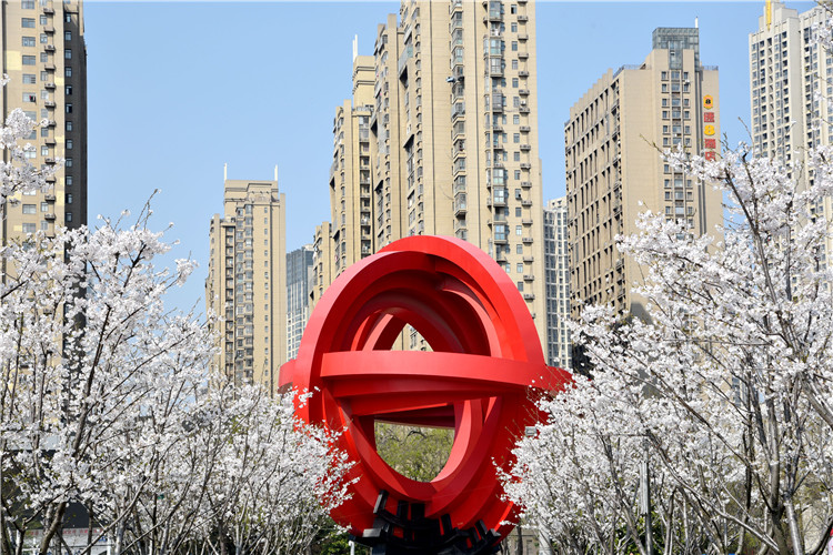 和平广场的樱花大道共种植了98株染井吉野樱,搭配上花瓣雕塑,樱花道与主景雕塑遥相呼应,美不胜收。