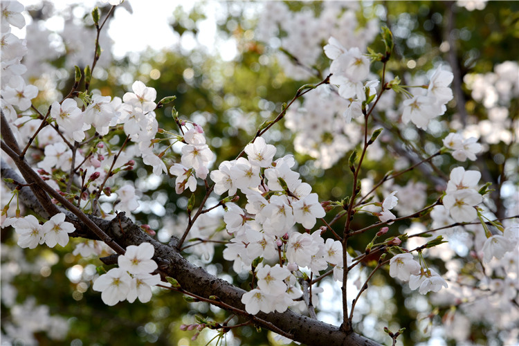 樱花大道上,抬眼望去满树皆白,簇簇樱花盛开,美若云朵,游客漫步其中,一派春意盎然。许多市民游客,纷纷拿起自己手中的相机,用照片定格眼前这绚烂的樱花之美。