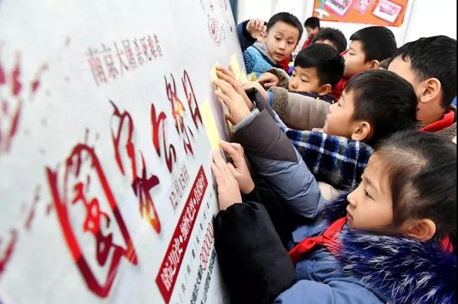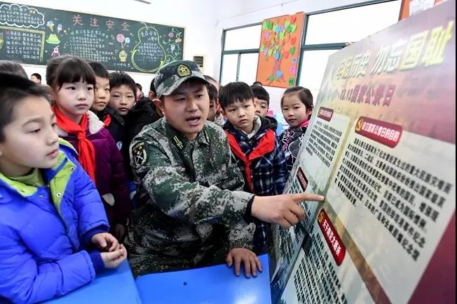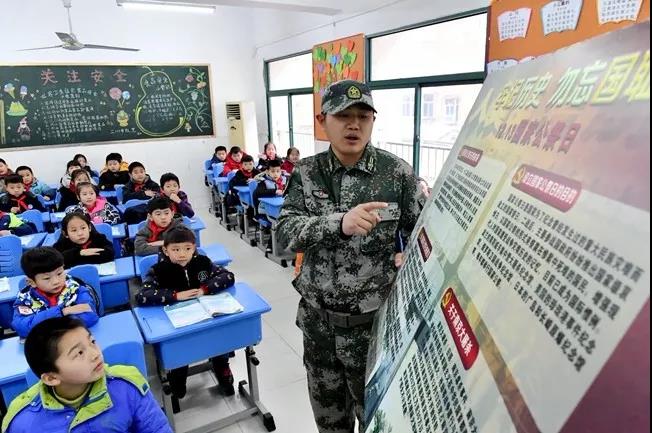 2018年12月11日,在合肥市滁州路小学二(1)班,学生们在志愿辅导员的带领下,了解南京大屠杀的惨痛历史,并将写有和平祈愿的卡片贴在心愿墙上。