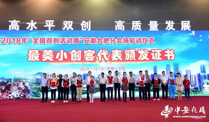 10月9日上午,“全国双创活动周”安徽合肥分会场活动在安徽国际会展中心举行。当天,2018年“合肥市十大最美小创客”代表颁奖仪式同步进行。省、市领导为十位最美小创客进行了颁奖。