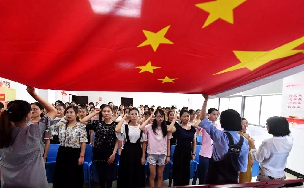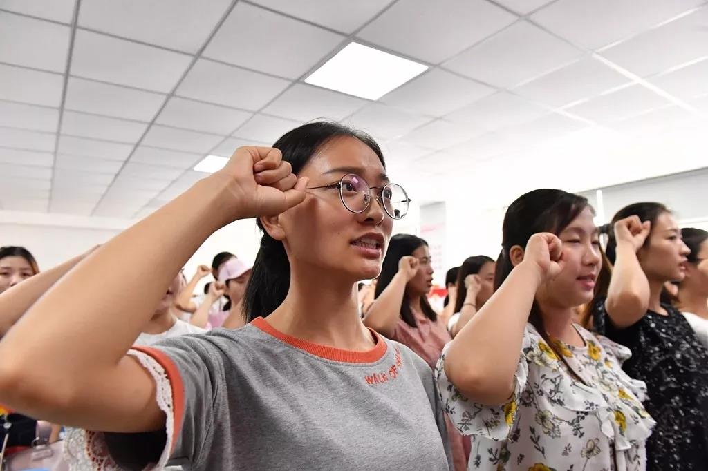 8月21日,在合肥市瑶海区教育体育局,新入职幼儿教师面对国旗庄严宣誓,用铿锵誓言发出从教心声。