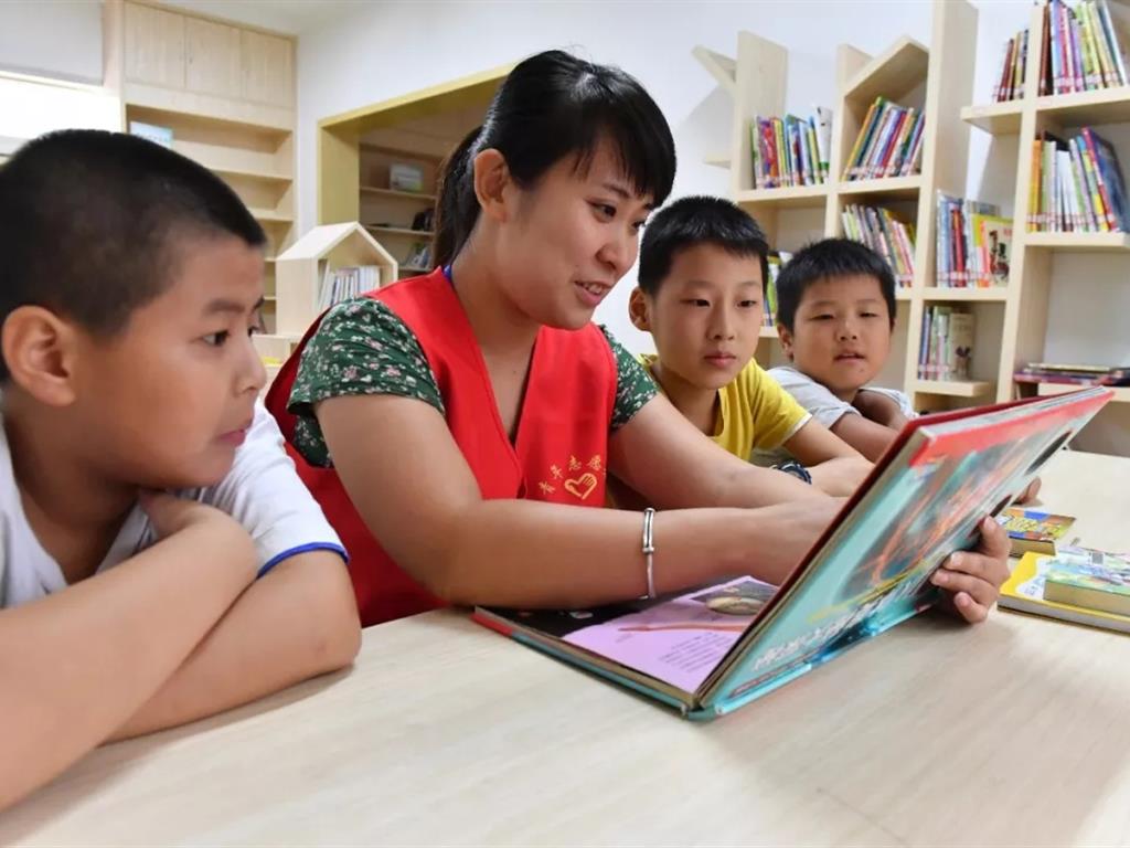 8月16日,在合肥市明光路街道填海巷社区少儿图书馆,青年志愿者正在指导孩子们阅读。