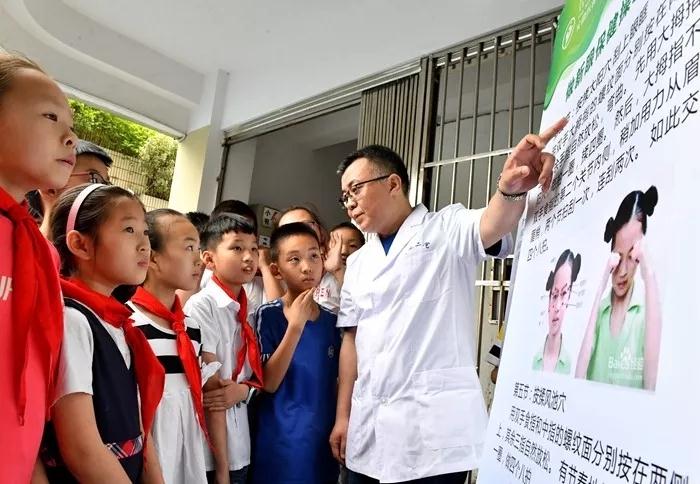 2018年6月5日,在合肥市大通路小学,合肥市第二人民医院眼科医生正为学生们讲解爱眼护眼保健知识。