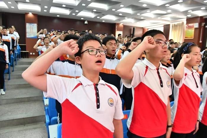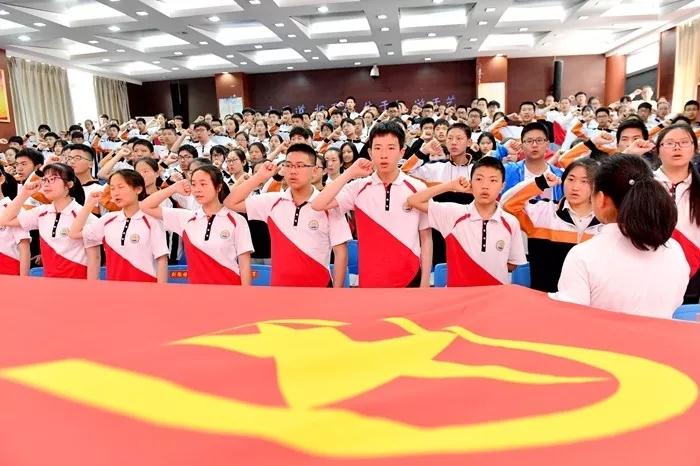 2018年5月3日,在合肥市第三十八中学,新团员面对团旗庄严宣誓,志愿加入中国共产主义青年团。