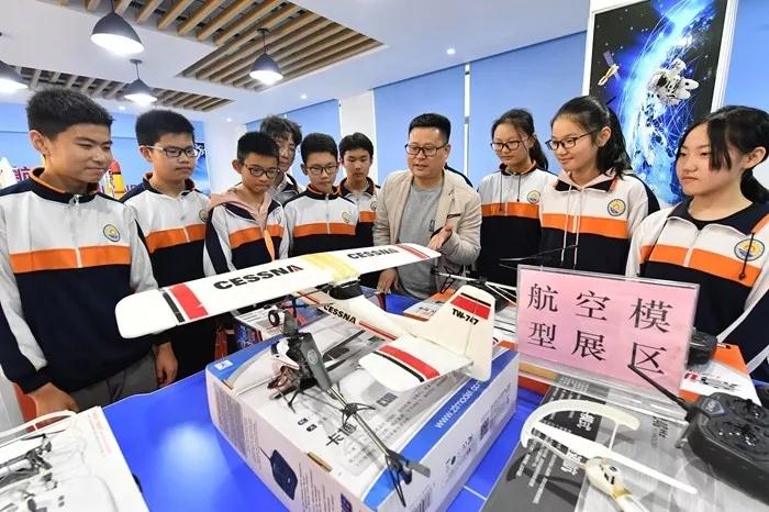 2018年4月23日,在合肥市第三十八中学科技馆,学生们在辅导员老师的带领下观看航空航天模型展。