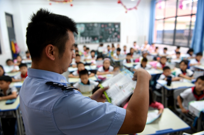 2017年8月31日,开学第一天,在合肥市和平小学,合肥交警瑶海大队民警正在为同学们上安全教育课,传授基本的安全常识和自救要领,帮助学生提高自我保护能力。