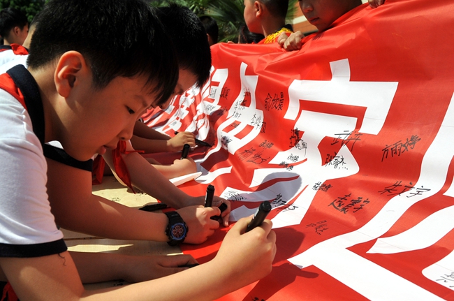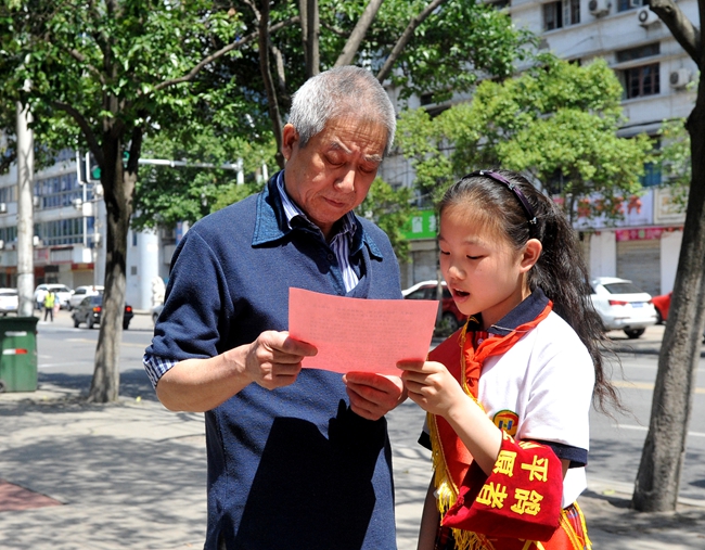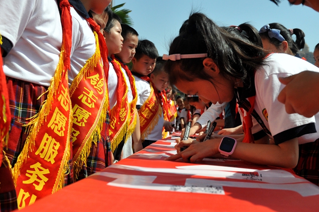 活动中,小小环保志愿者共同在“弘扬生态文明,共建绿色家园”主题宣传横幅上签名倡议,展示用废旧材料制作的环保手工艺品,走上街头向行人和市民宣传绿色环保、低碳生活,倡导人们爱护环境,共建绿色美好家园。