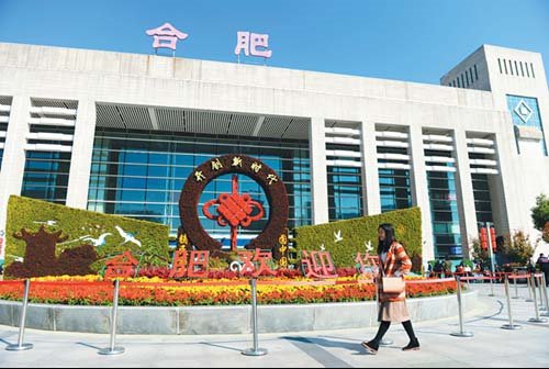 11月9日,旅客从合肥火车站站前广场的“合肥欢迎您”主题绿雕前经过。 近日,合肥火车站地区综管办利用6000株一串红、5500株黄橙色孔雀草和3500株紫色的彩叶苋等搭建徽文化主题绿雕“合肥欢迎您”,成为站前广场的一大迎宾景观,吸引过往旅客驻足观赏、拍照留影。